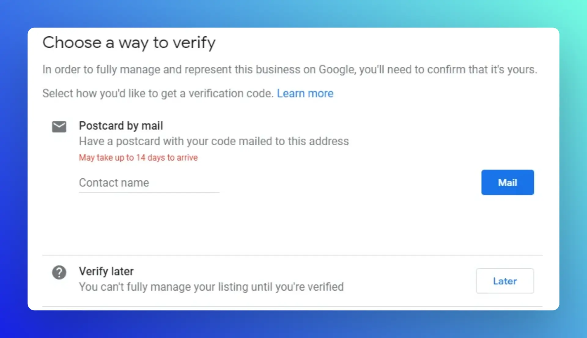 If available to your business, you can choose to receive a postcard with a verification code: