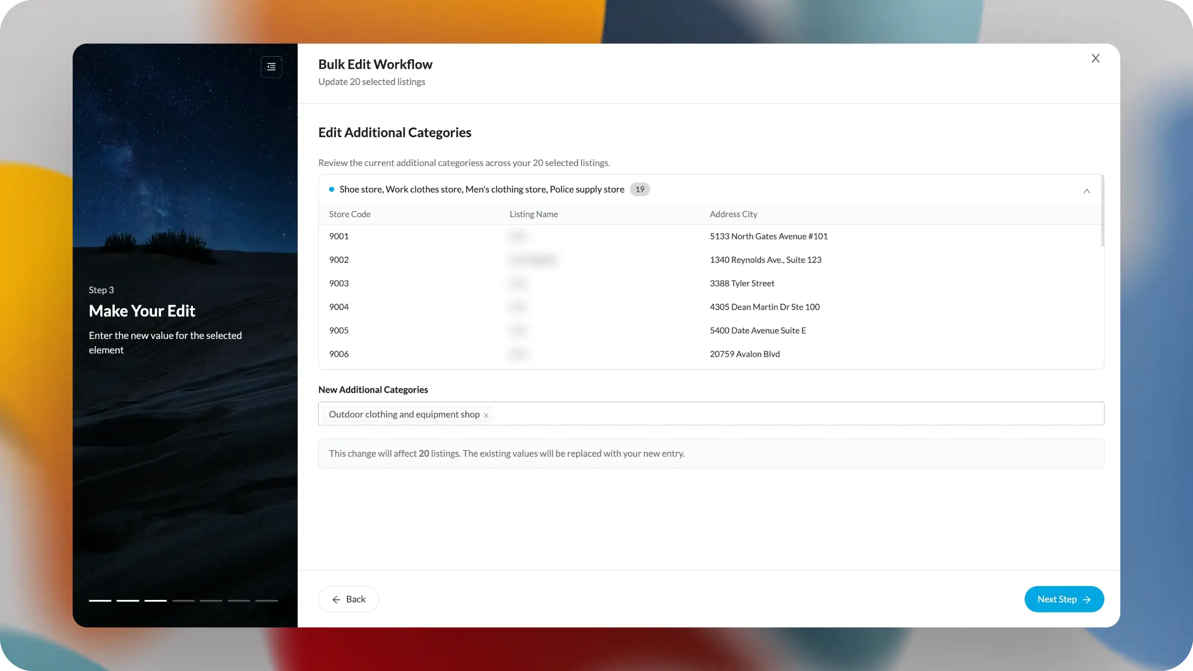 Instead of asking you to make a large edit with limited visibility, the workflow now shows exactly what is being changed, which listings are affected, what values currently exist, and what new value will replace them. This creates a more transparent editing process for high-impact fields like categories, attributes, hours, and other core listing details.